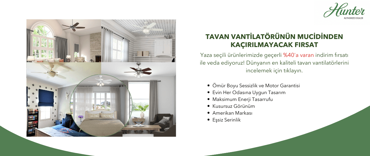 Hayatımızın vazgeçilmezi haline gelen, yaz – kış kullanıma uygun vantilatörlere ulaşmak artık daha kolay! Firmamız sizlerin ilgi ve ihtiyacına göre çeşitlilik gösteren fanlarını sizlere sunmaktan gurur duyuyor. Hunter Fan, yüksek kalite ürünleri ve eşsiz hizmeti sizlere sunuyor. Siz de dünyanın en iyi ve en kaliteli tavan vantilatörlerine “Ömür Boyu Motor ve Sessizlik Garantisi (100 Yıl)” fırsatı ile sahip olabilir, gönül rahatlığıyla kullanabilirsiniz.